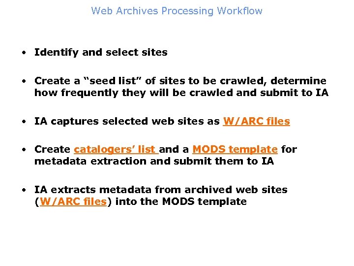 Web Archives Processing Workflow • Identify and select sites • Create a “seed list” of sites to be crawled, determine how frequently they will be crawled and submit to IA • IA captures selected web sites as W/ARC files • Create catalogers’ list and a MODS template for metadata extraction and submit them to IA • IA extracts metadata from archived web sites (W/ARC files) into the MODS template