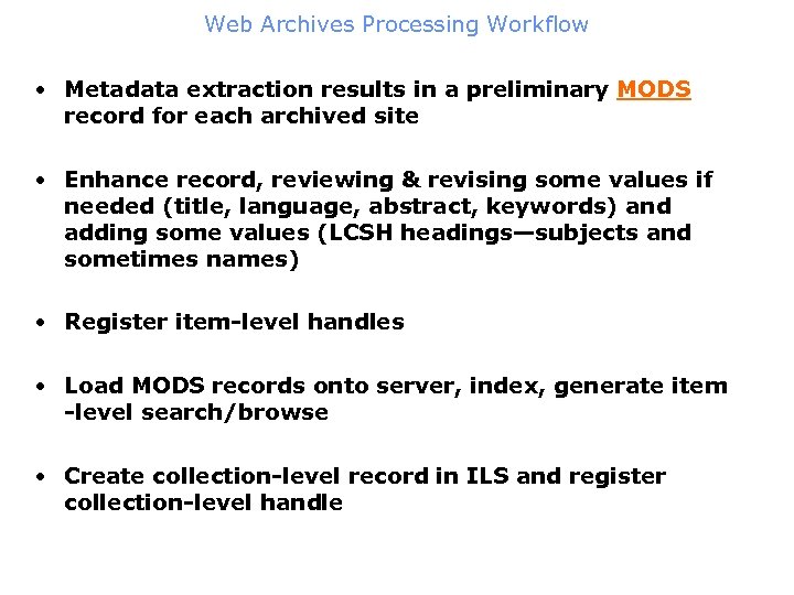 Web Archives Processing Workflow • Metadata extraction results in a preliminary MODS record for each archived site • Enhance record, reviewing & revising some values if needed (title, language, abstract, keywords) and adding some values (LCSH headings—subjects and sometimes names) • Register item-level handles • Load MODS records onto server, index, generate item -level search/browse • Create collection-level record in ILS and register collection-level handle