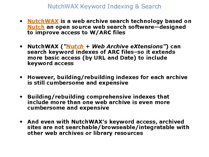 Nutch. WAX Keyword Indexing & Search • Nutch. WAX is a web archive search technology based on Nutch an open source web search software—designed to improve access to W/ARC files • Nutch. WAX ("Nutch + Web Archive e. Xtensions") can search keyword indexes of ARC files–so it extends more basic access (by URL and Date) to include keyword access • However, building/rebuilding indexes for each archive is still cumbersome and expensive • Building/rebuilding comprehensive indexes that include more than one web archive is even more cumbersome and expensive • And even with Nutch. WAX’s keyword access, archived sites are not searchable/browseable/integratable with other web archives or library resources