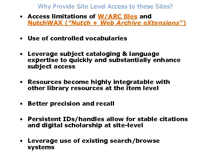 Why Provide Site Level Access to these Sites? • Access limitations of W/ARC files and Nutch. WAX ("Nutch + Web Archive e. Xtensions") • Use of controlled vocabularies • Leverage subject cataloging & language expertise to quickly and substantially enhance subject access • Resources become highly integratable with other library resources at the item level • Better precision and recall • Persistent IDs/handles allow for stable citations and digital scholarship at site-level • Leverage use of existing search/browse systems