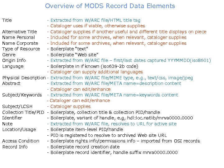 Overview of MODS Record Data Elements Title - Extracted from W/ARC file/HTML title tag - Cataloger uses if viable, otherwise supplies Alternative Title - Cataloger supplies if another useful and different title displays on piece Name Personal - Included for some archives, when relevant, cataloger supplies Name Corporate - Included for some archives, when relevant, cataloger supplies Type of Resource - Boilerplate “text” Genre - Boilerplate “Web site” Origin Info - Extracted from W/ARC file – first/last dates captured YYYMMDD(iso 8601) Language - Boilerplate in if known (iso 639 -2 b code) - Cataloger can supply additional languages Physical Description - Extracted from W/ARC file/MIME type, e. g. , text/css, image/jpeg Abstract - Extracted from W/ARC file/META name=description content - Cataloger can edit/enhance Subject/Keywords - Extracted from W/ARC file/META name=keywords content - Cataloger can edit/enhance Subject/LCSH - Cataloger supplies Collection Title/PID - Boilerplate, collection title & collection PID/handle Identifier - Boilerplate, variant of handle, e. g, hdl: loc. natlib/mrva 0000 Note - Extracted from W/ARC file, resolves to URL for active site Location/Usage - Boilerplate item-level PID/handle - PID is registered to resolve to archived Web site URL Access Condition - Boilerplate rights info/permissions info – imported from OSI records Record Info - Boilerplate record creation date - Boilerplate record identifier, handle suffix mrva 0000