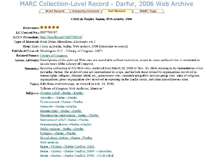 Crisis in Darfur, Sudan 2006 Web Archive size: 218 sites Harvest info: 1 phase, multiple captures Frequency: Varies--weekly to monthly crawls for each site Metadata: 1 collection-level MARC record, with collection level PID 218 item-level MODS records, with item-level PIDs LCSH: 1 boilerplate LCSH heading Unlimited specific LCSH headings at site level— these are selected by cataloger from a list of about 20 LCSH terms that relate to the content in the archive