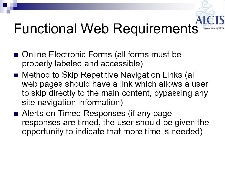 Functional Web Requirements n n n Online Electronic Forms (all forms must be properly labeled and accessible) Method to Skip Repetitive Navigation Links (all web pages should have a link which allows a user to skip directly to the main content, bypassing any site navigation information) Alerts on Timed Responses (if any page responses are timed, the user should be given the opportunity to indicate that more time is needed)