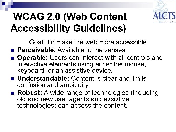 WCAG 2. 0 (Web Content Accessibility Guidelines) n n Goal: To make the web more accessible Perceivable: Available to the senses Operable: Users can interact with all controls and interactive elements using either the mouse, keyboard, or an assistive device. Understandable: Content is clear and limits confusion and ambiguity. Robust: A wide range of technologies (including old and new user agents and assistive technologies) can access the content.