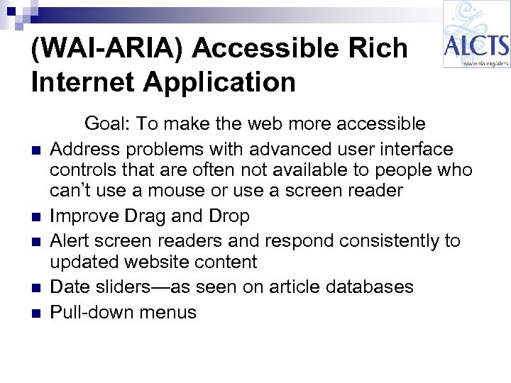 (WAI-ARIA) Accessible Rich Internet Application n n Goal: To make the web more accessible Address problems with advanced user interface controls that are often not available to people who can’t use a mouse or use a screen reader Improve Drag and Drop Alert screen readers and respond consistently to updated website content Date sliders—as seen on article databases Pull-down menus