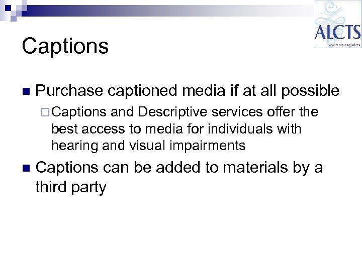 Captions n Purchase captioned media if at all possible ¨ Captions and Descriptive services offer the best access to media for individuals with hearing and visual impairments n Captions can be added to materials by a third party