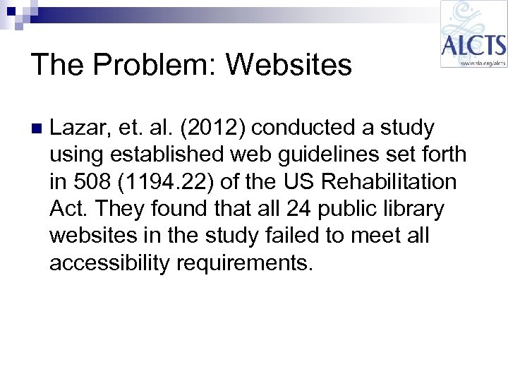 The Problem: Websites n Lazar, et. al. (2012) conducted a study using established web guidelines set forth in 508 (1194. 22) of the US Rehabilitation Act. They found that all 24 public library websites in the study failed to meet all accessibility requirements.