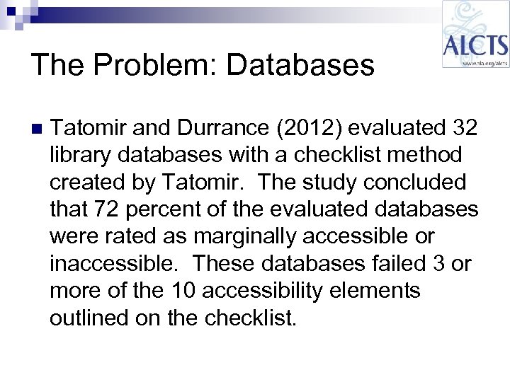 The Problem: Databases n Tatomir and Durrance (2012) evaluated 32 library databases with a checklist method created by Tatomir. The study concluded that 72 percent of the evaluated databases were rated as marginally accessible or inaccessible. These databases failed 3 or more of the 10 accessibility elements outlined on the checklist.