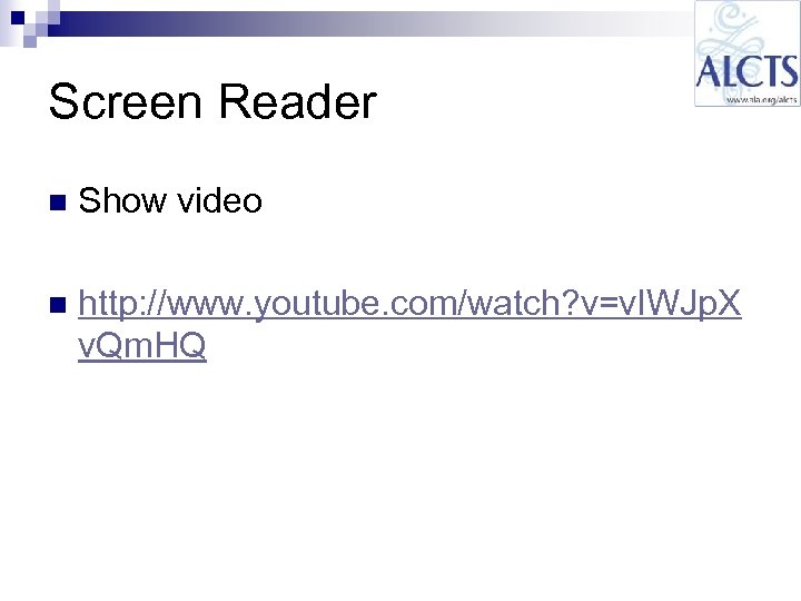 Screen Reader n Show video n http: //www. youtube. com/watch? v=v. IWJp. X v. Qm. HQ