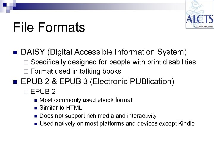 File Formats n DAISY (Digital Accessible Information System) ¨ Specifically designed for people with print disabilities ¨ Format used in talking books n EPUB 2 & EPUB 3 (Electronic PUBlication) ¨ EPUB 2 n Most commonly used ebook format n Similar to HTML n Does not support rich media and interactivity n Used natively on most platforms and devices except Kindle