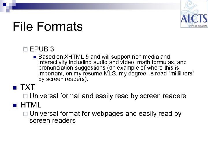 File Formats ¨ EPUB 3 n Based on XHTML 5 and will support rich media and interactivity including audio and video, math formulas, and pronunciation suggestions (an example of where this is important, on my resume MLS, my degree, is read “milliliters” by screen readers). n TXT ¨ Universal format and easily read by screen readers n HTML ¨ Universal format for webpages and easily read by screen readers