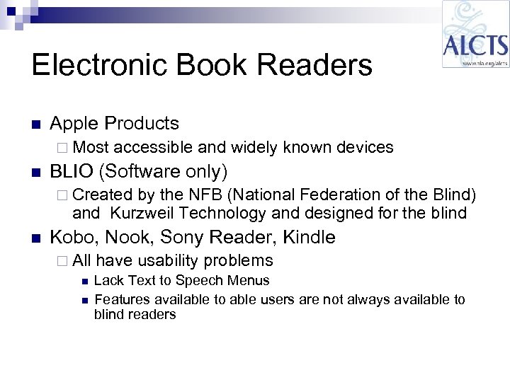 Electronic Book Readers n Apple Products ¨ Most accessible and widely known devices n BLIO (Software only) ¨ Created by the NFB (National Federation of the Blind) and Kurzweil Technology and designed for the blind n Kobo, Nook, Sony Reader, Kindle ¨ All have usability problems n Lack Text to Speech Menus n Features available to able users are not always available to blind readers