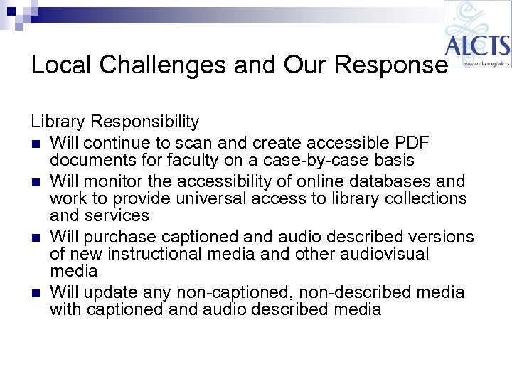 Local Challenges and Our Response Library Responsibility n Will continue to scan and create accessible PDF documents for faculty on a case-by-case basis n Will monitor the accessibility of online databases and work to provide universal access to library collections and services n Will purchase captioned and audio described versions of new instructional media and other audiovisual media n Will update any non-captioned, non-described media with captioned and audio described media
