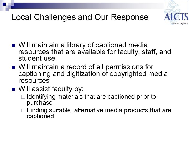 Local Challenges and Our Response n n n Will maintain a library of captioned media resources that are available for faculty, staff, and student use Will maintain a record of all permissions for captioning and digitization of copyrighted media resources Will assist faculty by: ¨ Identifying materials that are captioned prior to purchase ¨ Finding suitable, alternative media products that are captioned