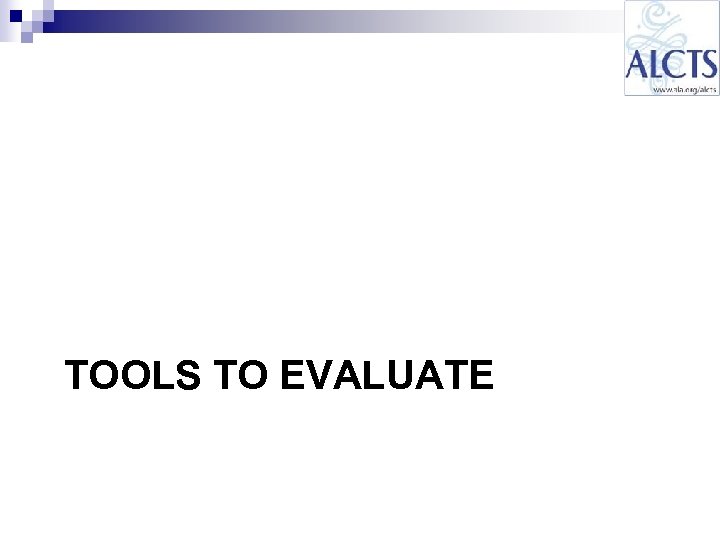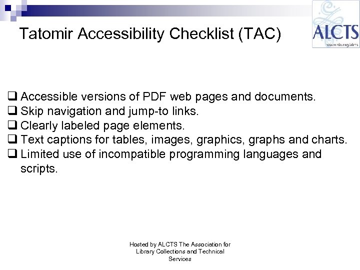 Tatomir Accessibility Checklist (TAC) q Accessible versions of PDF web pages and documents. q Skip navigation and jump-to links. q Clearly labeled page elements. q Text captions for tables, images, graphics, graphs and charts. q Limited use of incompatible programming languages and scripts. Hosted by ALCTS The Association for Library Collections and Technical Services