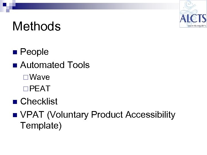 Methods People n Automated Tools n ¨ Wave ¨ PEAT Checklist n VPAT (Voluntary Product Accessibility Template) n