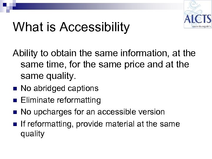 What is Accessibility Ability to obtain the same information, at the same time, for the same price and at the same quality. n n No abridged captions Eliminate reformatting No upcharges for an accessible version If reformatting, provide material at the same quality