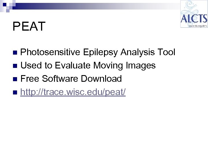 PEAT Photosensitive Epilepsy Analysis Tool n Used to Evaluate Moving Images n Free Software Download n http: //trace. wisc. edu/peat/ n