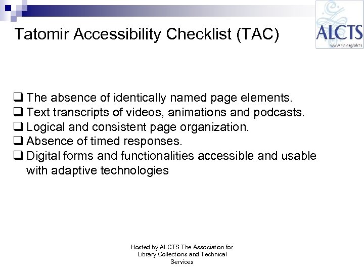 Tatomir Accessibility Checklist (TAC) q The absence of identically named page elements. q Text transcripts of videos, animations and podcasts. q Logical and consistent page organization. q Absence of timed responses. q Digital forms and functionalities accessible and usable with adaptive technologies Hosted by ALCTS The Association for Library Collections and Technical Services