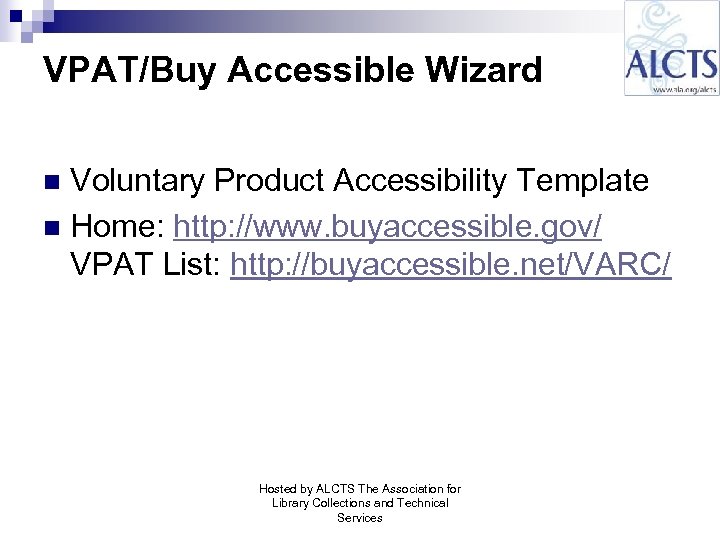 VPAT/Buy Accessible Wizard Voluntary Product Accessibility Template n Home: http: //www. buyaccessible. gov/ VPAT List: http: //buyaccessible. net/VARC/ n Hosted by ALCTS The Association for Library Collections and Technical Services