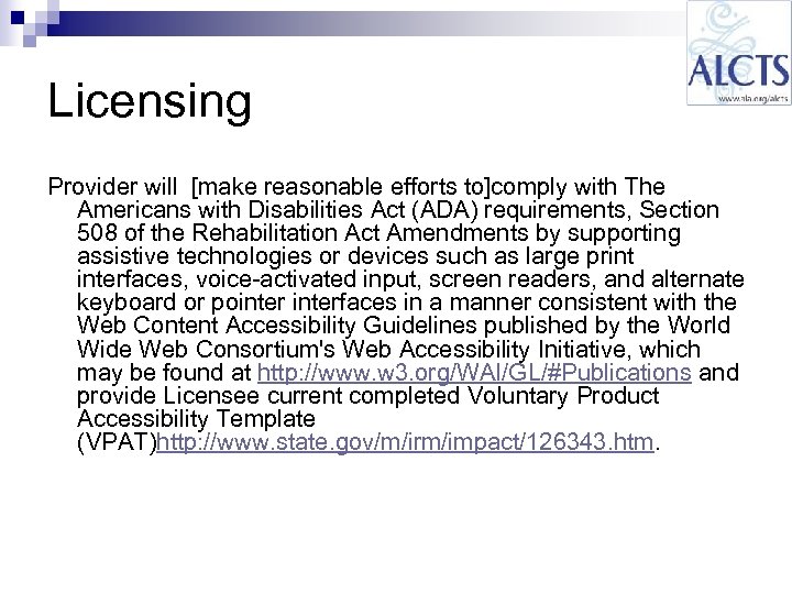 Licensing Provider will [make reasonable efforts to]comply with The Americans with Disabilities Act (ADA) requirements, Section 508 of the Rehabilitation Act Amendments by supporting assistive technologies or devices such as large print interfaces, voice-activated input, screen readers, and alternate keyboard or pointerfaces in a manner consistent with the Web Content Accessibility Guidelines published by the World Wide Web Consortium's Web Accessibility Initiative, which may be found at http: //www. w 3. org/WAI/GL/#Publications and provide Licensee current completed Voluntary Product Accessibility Template (VPAT)http: //www. state. gov/m/irm/impact/126343. htm.