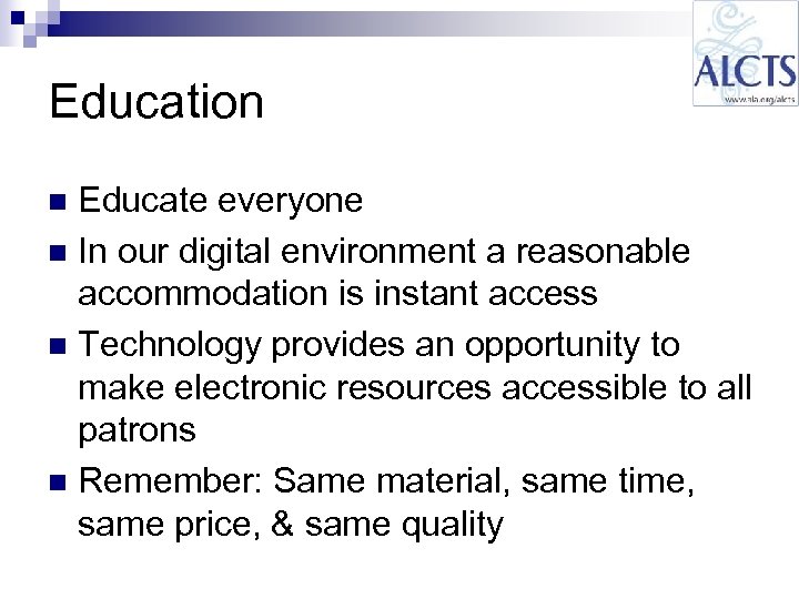 Education Educate everyone n In our digital environment a reasonable accommodation is instant access n Technology provides an opportunity to make electronic resources accessible to all patrons n Remember: Same material, same time, same price, & same quality n