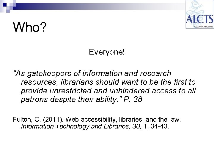 Who? Everyone! “As gatekeepers of information and research resources, librarians should want to be the first to provide unrestricted and unhindered access to all patrons despite their ability. ” P. 38 Fulton, C. (2011). Web accessibility, libraries, and the law. Information Technology and Libraries, 30, 1, 34 -43.