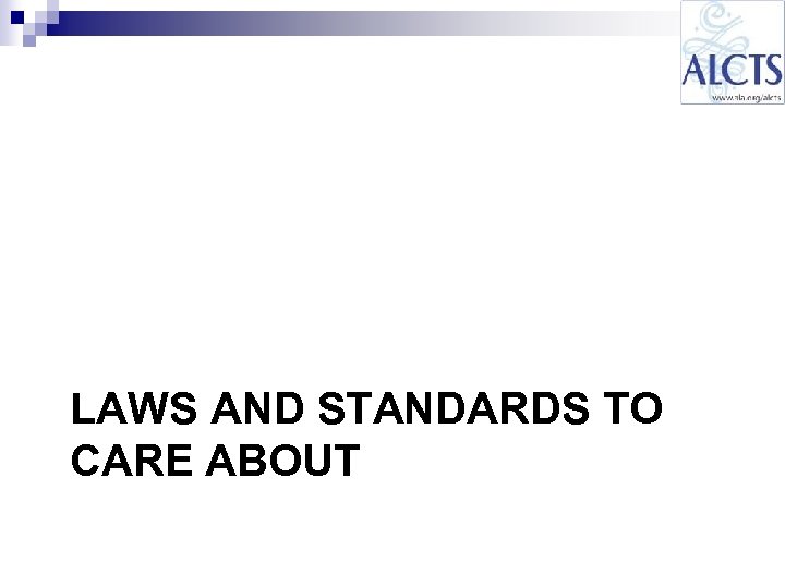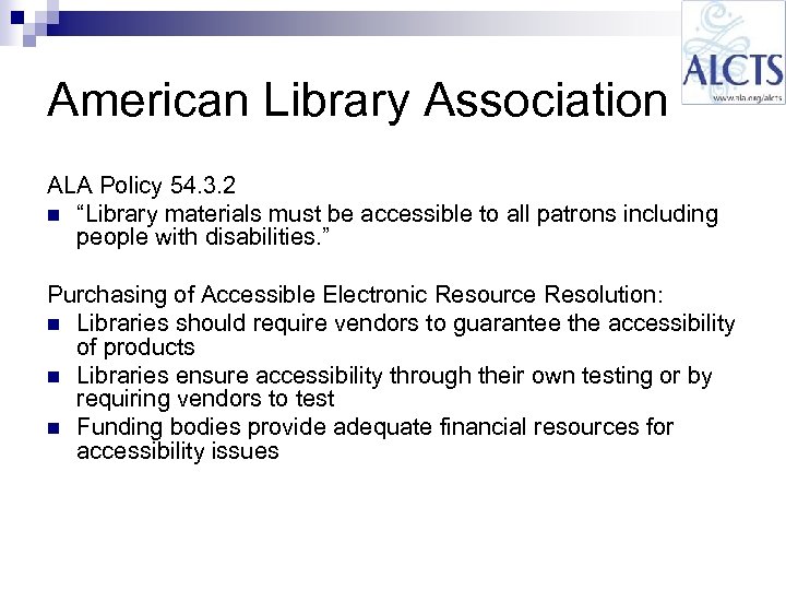 American Library Association ALA Policy 54. 3. 2 n “Library materials must be accessible to all patrons including people with disabilities. ” Purchasing of Accessible Electronic Resource Resolution: n Libraries should require vendors to guarantee the accessibility of products n Libraries ensure accessibility through their own testing or by requiring vendors to test n Funding bodies provide adequate financial resources for accessibility issues