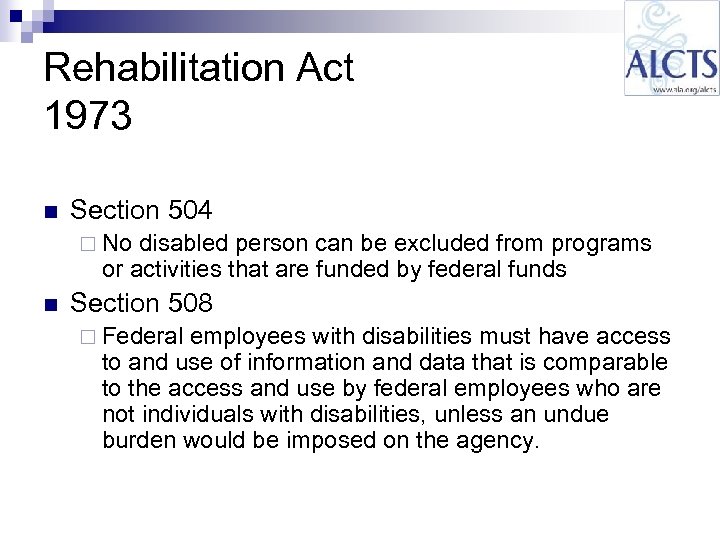 Rehabilitation Act 1973 n Section 504 ¨ No disabled person can be excluded from programs or activities that are funded by federal funds n Section 508 ¨ Federal employees with disabilities must have access to and use of information and data that is comparable to the access and use by federal employees who are not individuals with disabilities, unless an undue burden would be imposed on the agency.