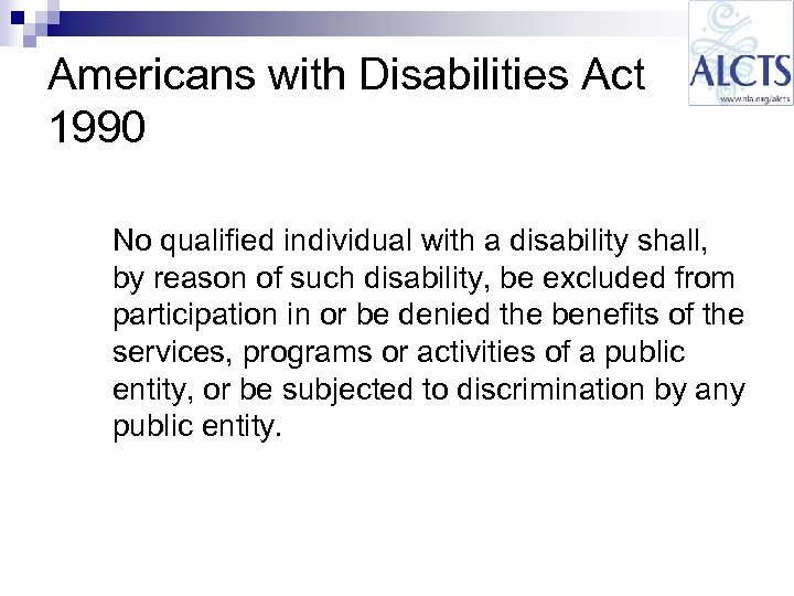 Americans with Disabilities Act 1990 No qualified individual with a disability shall, by reason of such disability, be excluded from participation in or be denied the benefits of the services, programs or activities of a public entity, or be subjected to discrimination by any public entity.