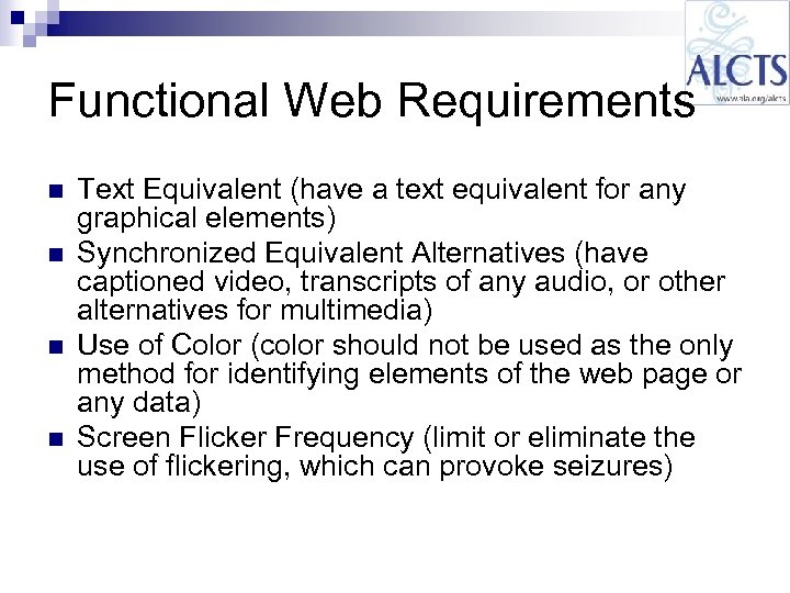 Functional Web Requirements n n Text Equivalent (have a text equivalent for any graphical elements) Synchronized Equivalent Alternatives (have captioned video, transcripts of any audio, or other alternatives for multimedia) Use of Color (color should not be used as the only method for identifying elements of the web page or any data) Screen Flicker Frequency (limit or eliminate the use of flickering, which can provoke seizures)