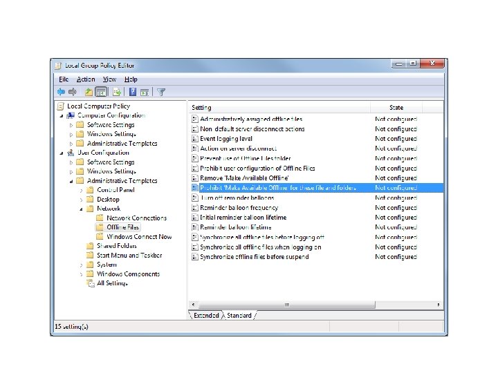 Prohibiting a Network Folder from Being Made Available Offline • You might want to prevent the slow synchronization, or prevent copies of the file being taken out of the building • This can be adjusted in Group Policy, as well as many other settings of Offline Files