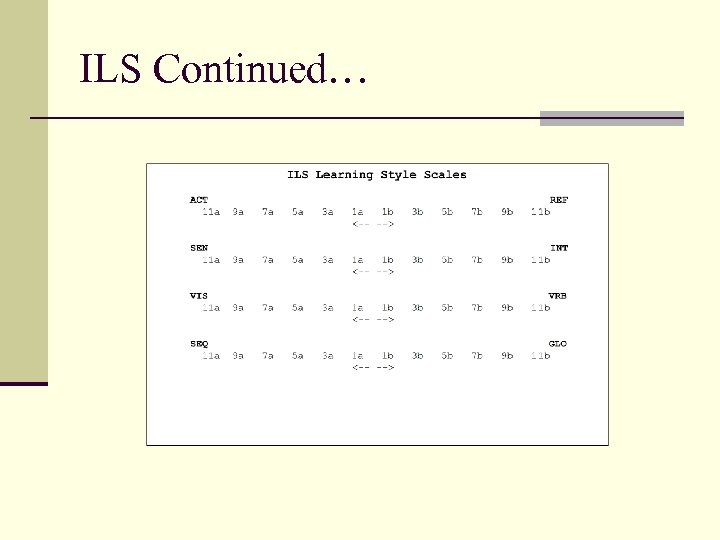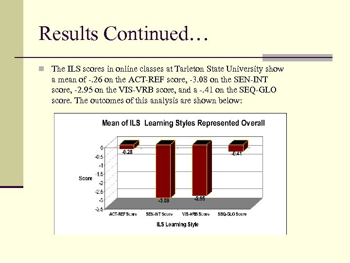 Results Continued… n The ILS scores in online classes at Tarleton State University show a mean of -. 26 on the ACT-REF score, -3. 08 on the SEN-INT score, -2. 95 on the VIS-VRB score, and a -. 41 on the SEQ-GLO score. The outcomes of this analysis are shown below: