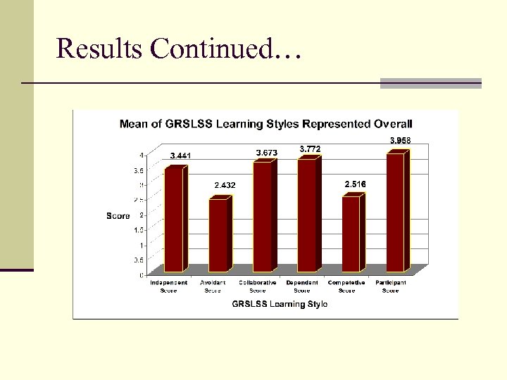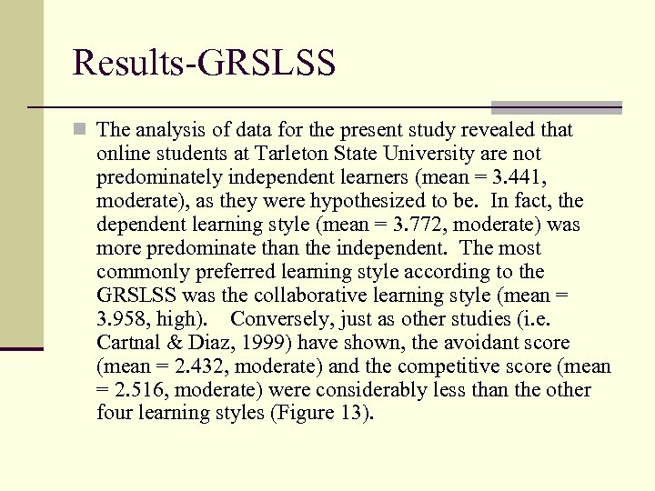 Results-GRSLSS n The analysis of data for the present study revealed that online students at Tarleton State University are not predominately independent learners (mean = 3. 441, moderate), as they were hypothesized to be. In fact, the dependent learning style (mean = 3. 772, moderate) was more predominate than the independent. The most commonly preferred learning style according to the GRSLSS was the collaborative learning style (mean = 3. 958, high). Conversely, just as other studies (i. e. Cartnal & Diaz, 1999) have shown, the avoidant score (mean = 2. 432, moderate) and the competitive score (mean = 2. 516, moderate) were considerably less than the other four learning styles (Figure 13).