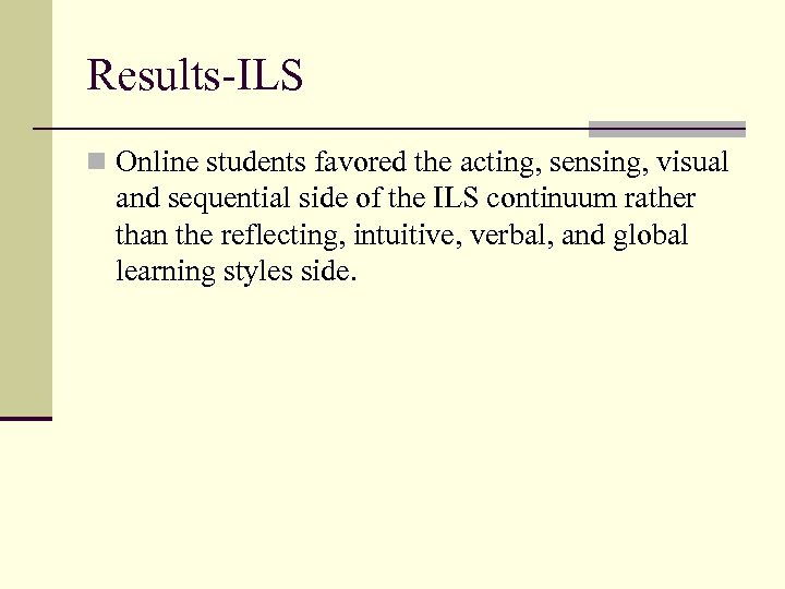 Results-ILS n Online students favored the acting, sensing, visual and sequential side of the ILS continuum rather than the reflecting, intuitive, verbal, and global learning styles side.