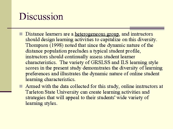 Discussion n Distance learners are a heterogeneous group, and instructors should design learning activities to capitalize on this diversity. Thompson (1998) noted that since the dynamic nature of the distance population precludes a typical student profile, instructors should continually assess student learner characteristics. The variety of GRSLSS and ILS learning style scores in the present study demonstrates the diversity of learning preferences and illustrates the dynamic nature of online student learning characteristics. n Armed with the data collected for this study, online instructors at Tarleton State University can create learning activities and strategies that will appeal to their students' wide variety of learning styles.