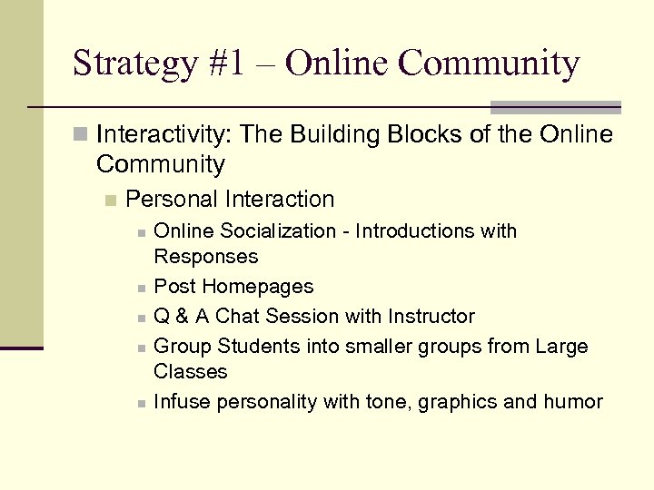 Strategy #1 – Online Community n Interactivity: The Building Blocks of the Online Community n Personal Interaction n n Online Socialization - Introductions with Responses Post Homepages Q & A Chat Session with Instructor Group Students into smaller groups from Large Classes Infuse personality with tone, graphics and humor
