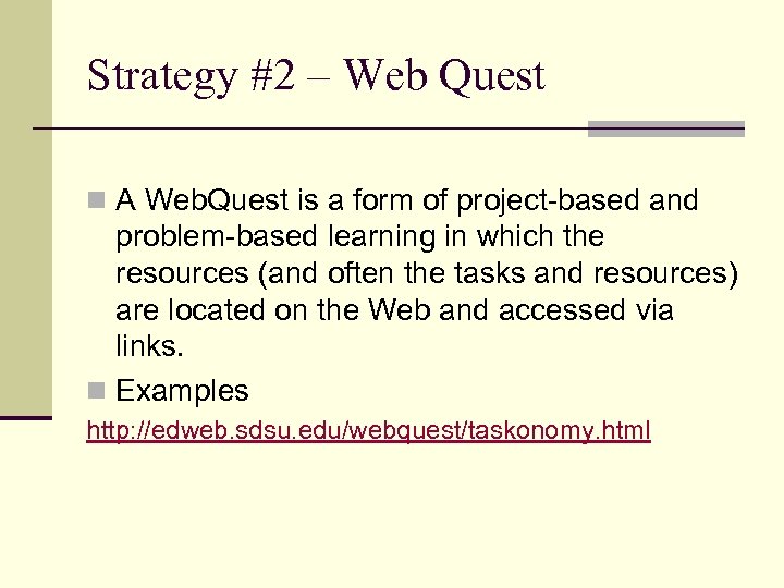 Strategy #2 – Web Quest n A Web. Quest is a form of project-based and problem-based learning in which the resources (and often the tasks and resources) are located on the Web and accessed via links. n Examples http: //edweb. sdsu. edu/webquest/taskonomy. html