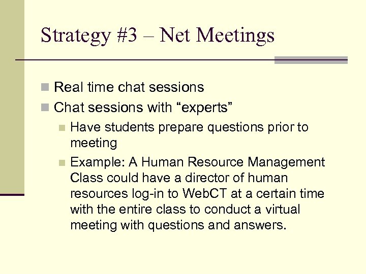 Strategy #3 – Net Meetings n Real time chat sessions n Chat sessions with “experts” n Have students prepare questions prior to meeting n Example: A Human Resource Management Class could have a director of human resources log-in to Web. CT at a certain time with the entire class to conduct a virtual meeting with questions and answers.