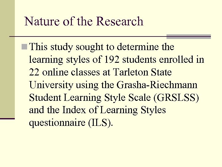 Nature of the Research n This study sought to determine the learning styles of 192 students enrolled in 22 online classes at Tarleton State University using the Grasha-Riechmann Student Learning Style Scale (GRSLSS) and the Index of Learning Styles questionnaire (ILS).
