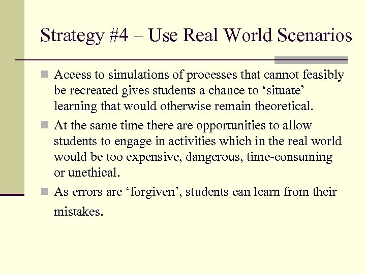 Strategy #4 – Use Real World Scenarios n Access to simulations of processes that cannot feasibly be recreated gives students a chance to ‘situate’ learning that would otherwise remain theoretical. n At the same time there are opportunities to allow students to engage in activities which in the real world would be too expensive, dangerous, time-consuming or unethical. n As errors are ‘forgiven’, students can learn from their mistakes.
