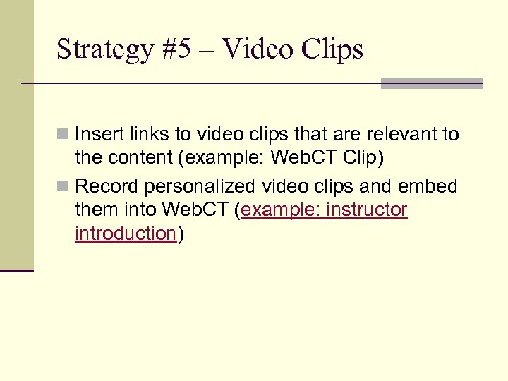 Strategy #5 – Video Clips n Insert links to video clips that are relevant to the content (example: Web. CT Clip) n Record personalized video clips and embed them into Web. CT (example: instructor introduction)