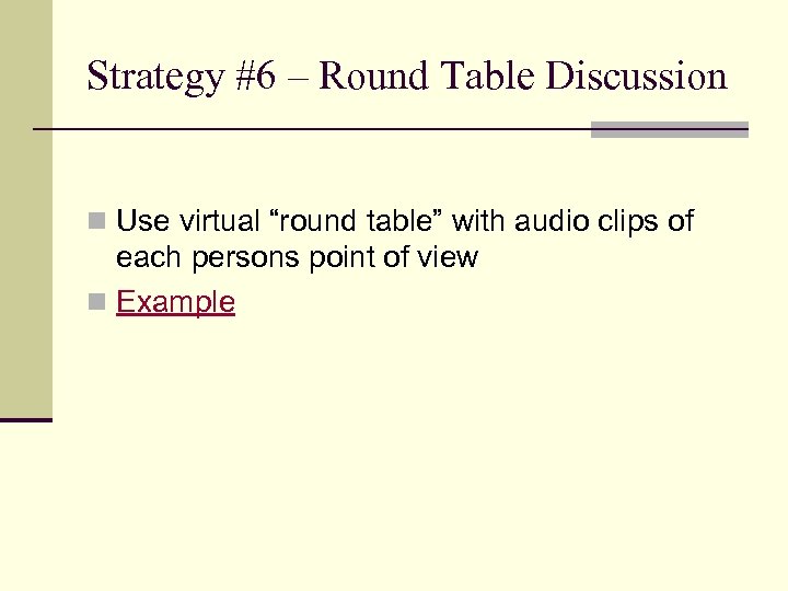 Strategy #6 – Round Table Discussion n Use virtual “round table” with audio clips of each persons point of view n Example