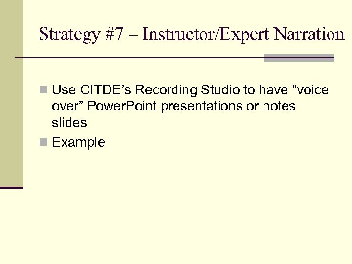 Strategy #7 – Instructor/Expert Narration n Use CITDE’s Recording Studio to have “voice over” Power. Point presentations or notes slides n Example