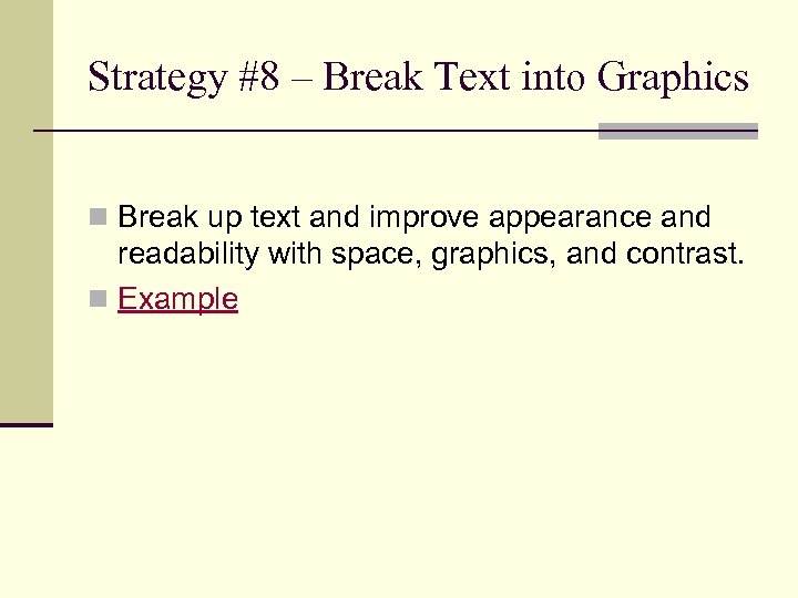 Strategy #8 – Break Text into Graphics n Break up text and improve appearance and readability with space, graphics, and contrast. n Example