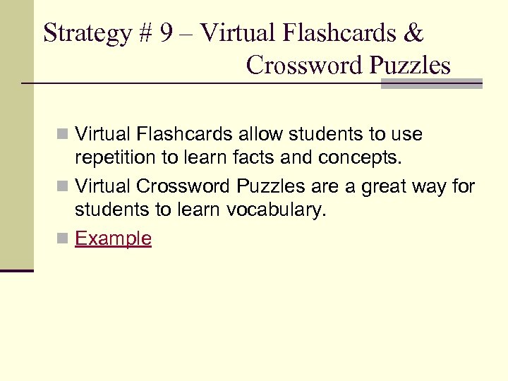 Strategy # 9 – Virtual Flashcards & Crossword Puzzles n Virtual Flashcards allow students to use repetition to learn facts and concepts. n Virtual Crossword Puzzles are a great way for students to learn vocabulary. n Example