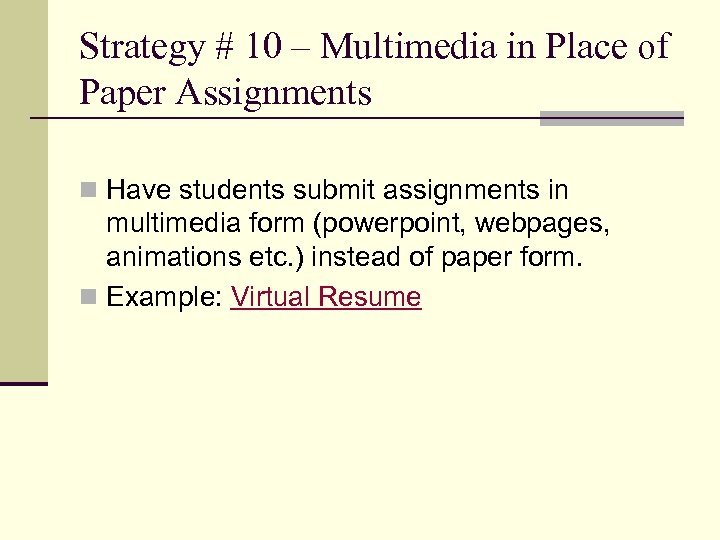 Strategy # 10 – Multimedia in Place of Paper Assignments n Have students submit assignments in multimedia form (powerpoint, webpages, animations etc. ) instead of paper form. n Example: Virtual Resume