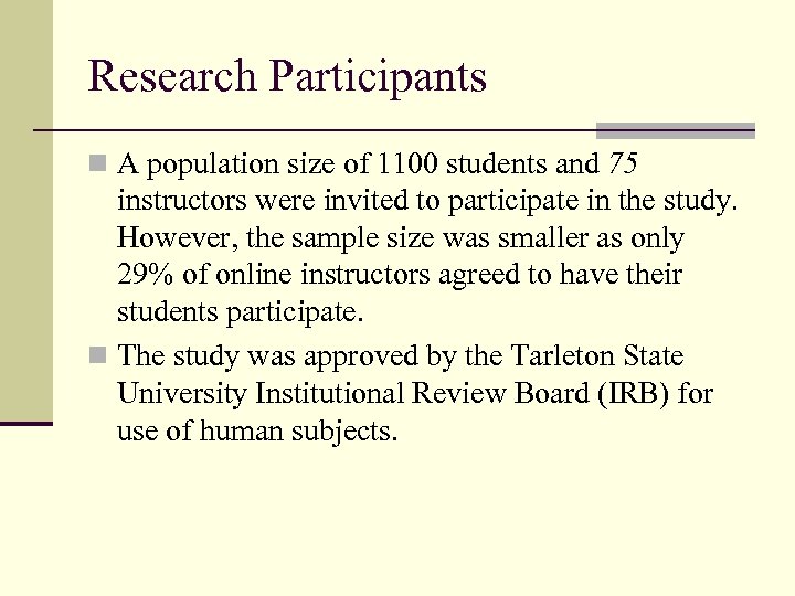 Research Participants n A population size of 1100 students and 75 instructors were invited to participate in the study. However, the sample size was smaller as only 29% of online instructors agreed to have their students participate. n The study was approved by the Tarleton State University Institutional Review Board (IRB) for use of human subjects.