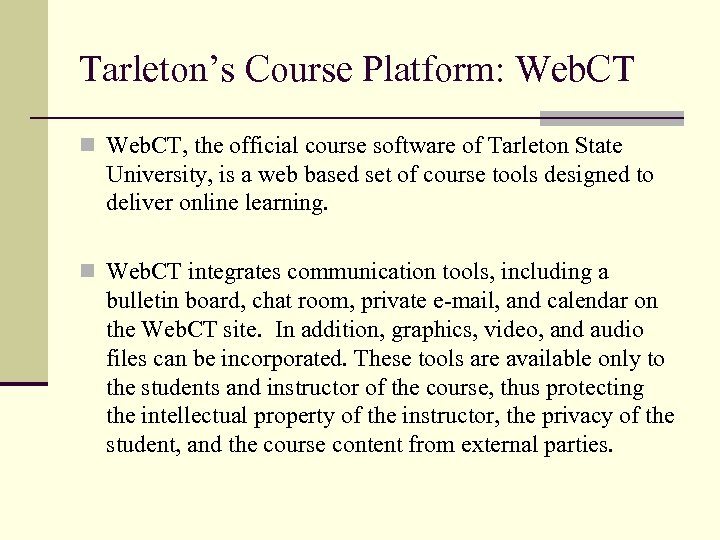 Tarleton’s Course Platform: Web. CT n Web. CT, the official course software of Tarleton State University, is a web based set of course tools designed to deliver online learning. n Web. CT integrates communication tools, including a bulletin board, chat room, private e-mail, and calendar on the Web. CT site. In addition, graphics, video, and audio files can be incorporated. These tools are available only to the students and instructor of the course, thus protecting the intellectual property of the instructor, the privacy of the student, and the course content from external parties.