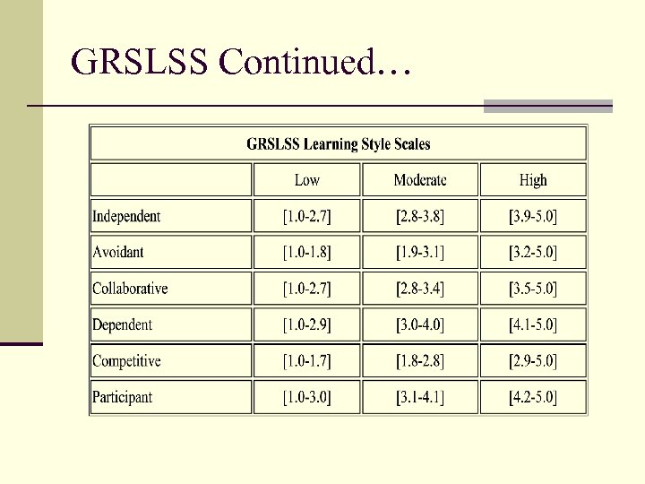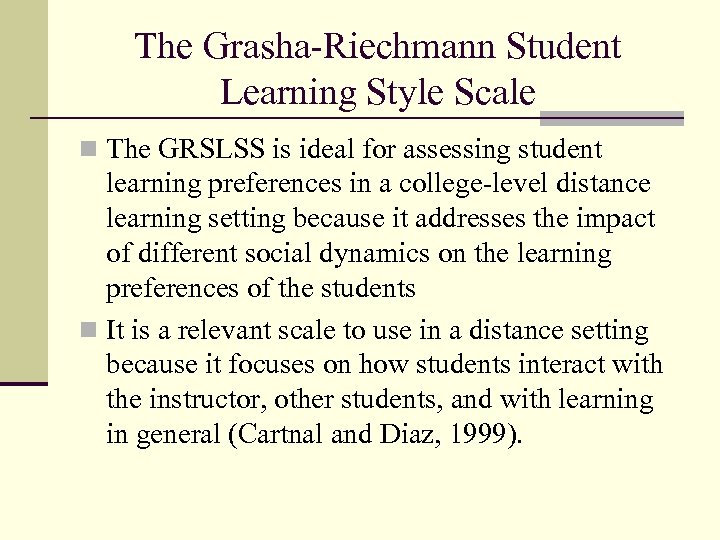 The Grasha-Riechmann Student Learning Style Scale n The GRSLSS is ideal for assessing student learning preferences in a college-level distance learning setting because it addresses the impact of different social dynamics on the learning preferences of the students n It is a relevant scale to use in a distance setting because it focuses on how students interact with the instructor, other students, and with learning in general (Cartnal and Diaz, 1999).